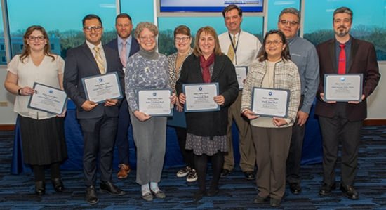 (Back): Karen Eckhart, M.A., B.S., Financial Aid Administrator, Student Financial Services; Joshua Baker, O.D., M.S., Senior Vice President and Chief Academic Officer; Deanne Drozdz, M.A., M.B.A., (CHS-Downers Grove PT); Joshua Edwards, Ph.D., Professor, Pharmacology, (CGS-Downers Grove); Antonio Perez, Senior Network Engineer, Information Technology Services; Hilal Arnouk, M.D., Ph.D., Associate Professor, Pathology, (CGS-Downers Grove).