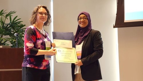 Shuaa Rizvi, a graduate of the Master of Biomedical Sciences Program, is presented with a first-place award.