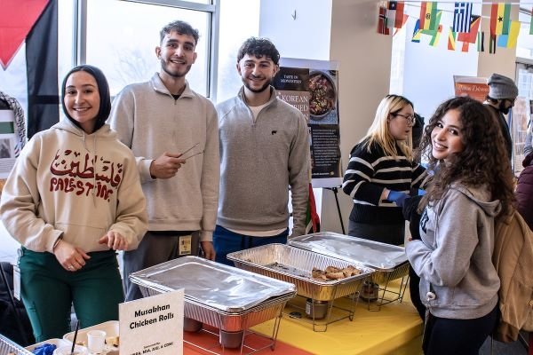 Several tables lined the Commons cafeteria and featured a variety of posters about different countries with accompanying cultural dishes sponsored by several student organizations. The dishes on display included Jamaican jerk-style chicken, quesadillas, Yemeni Adeni chai and pastries, Korean fried chicken with hot honey or soy flavors, several traditional Greek desserts, Brazilian Brigadeiro (chocolate truffles), and a Palestinian dish, Musakhan (chicken rolls).